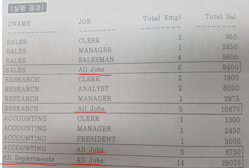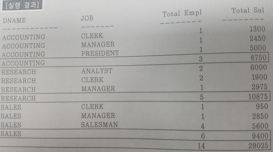 결과를 보면 알 수 있듯이 부서별로 먼저 정렬이 되고, 이후에 JOB 별로 정렬이 되서 total empl과 total sal 값이 나오는 것을 볼 수 있다.